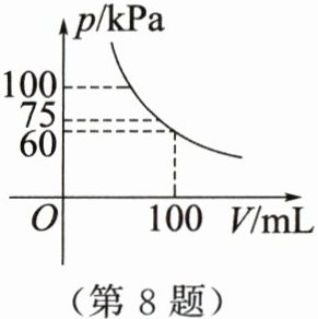 8. 在恒温下,气体对汽缸壁的压强$p$(单位:kPa)与汽缸内气体体积$V$(单位:mL)的函数关系如图所示.若压强由75kPa增加到100kPa,则气体体积压缩了 ()
