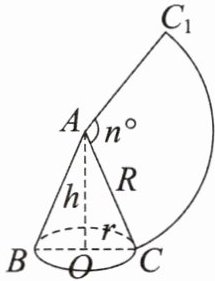 如图,沿着圆锥的一条母线,把一个圆锥的侧面展开得到一个扇形,若圆锥的底面圆的半径为 $ r $,母线长为 $ R $,扇形圆心角为 $ n^{\circ} $,则扇形的弧长为 $ $ $ = $ $ $;圆锥的侧面积为 $ $ $ = $ $ $;圆锥的全面积为 $ $;圆锥的高 $ h = $ $ $;圆心角 $ n^{\circ} = $ $ $。