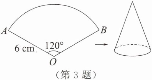 3. 如图,已知扇形 $ AOB $ 的半径为 $ 6 \mathrm{cm} $,圆心角的度数为 $ 120^{\circ} $,若将此扇形围成一个圆锥的侧面,则围成的圆锥底面圆的半径为()