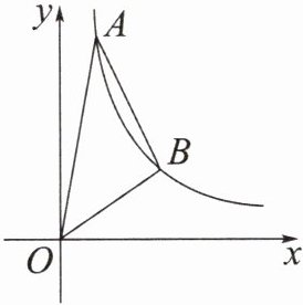 如图,在平面直角坐标系中,点 $ A(m, 6) $,$ B(3, n) $ 均在反比例函数 $ y = \frac{k}{x}(x > 0) $ 的图象上。若 $ \triangle AOB $ 的面积为 8,则 $ k $ 的值为______。