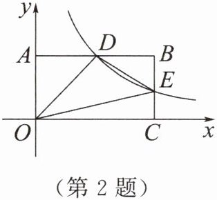 2. 如图,矩形 $ OABC $ 的顶点 $ A $,$ C $ 分别在 $ y $ 轴、$ x $ 轴的正半轴上,$ D $ 为 $ AB $ 的中点,反比例函数 $ y = \frac{k}{x}(x > 0) $ 的图象经过点 $ D $,且与 $ BC $ 交于点 $ E $,连接 $ OD $,$ OE $,$ DE $。若 $ \triangle ODE $ 的面积为 3,则 $ k $ 的值为______。