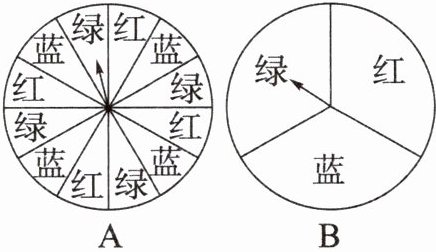 5.(教材 $ P_{152}T_2 $ 改编)如图,两个相同的可以自由转动的转盘 $ A $ 和 $ B $,$ A $ 盘被平均分为 12 份,红、绿、蓝三种颜色均匀分布;$ B $ 盘被平均分为红、绿和蓝 3 份。分别转动 $ A $ 盘和 $ B $ 盘,$ A $ 盘停止时指针指向红色的概率与 $ B $ 盘停止时指针指向红色的概率哪个大?为什么?
