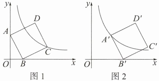 (2) 如图 2,将正方形 $ A B C D $ 沿 $ x $ 轴向右平移得到正方形 $ A ^ { \prime } B ^ { \prime } C ^ { \prime } D ^ { \prime } $,点 $ A ^ { \prime } $ 恰好落在反比例函数的图象上,求此时点 $ D ^ { \prime } $ 的坐标。