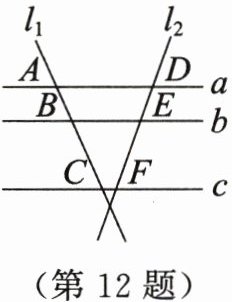 12. 如图,直线$a// b// c$,直线$l_{1},l_{2}$与这三条平行线分别交于点A,B,C和点D,E,F.若$AB:BC= 1:2,DE= 3$,则EF的长为