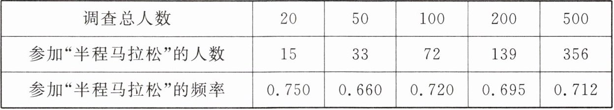 1. 某市半程马拉松的赛事共有“半程马拉松”和“欢乐跑”两项,参赛选手只能参加其中一项. 小明是该项赛事的志愿者,为估算本次赛事参加“半程马拉松”的人数,小明对部分参赛选手做了调查,调查结果如表所示.