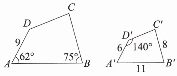 4. 如图,四边形 $ ABCD $ 与四边形 $ A'B'C'D' $ 相似,且 $ \angle A = 62^\circ $,$ \angle B = 75^\circ $,$ \angle D' = 140^\circ $,$ AD = 9 $,$ A'B' = 11 $,$ A'D' = 6 $,$ B'C' = 8 $.