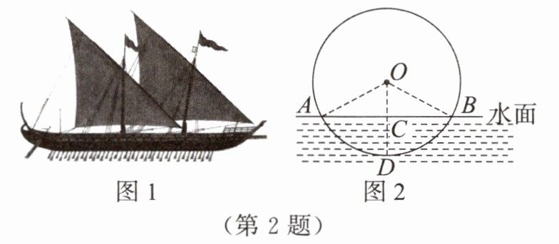 2. (2024福州屏东中学月考)唐代李皋发明的“桨轮船”如图1所示.某桨轮船的轮子被水面截得AB为10,轮子的吃水深度CD为3,如图2所示,则该桨轮船的轮子半径为 (