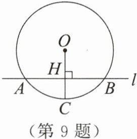9. 如图,$\odot O的半径OC = 5\mathrm{cm}$,直线$l\perp OC$,垂足为$H$,且$l交\odot O于A$,$B$两点,$AB = 8\mathrm{cm}$.若$l沿OC所在直线平移后与\odot O$相切,则平移的距离是(