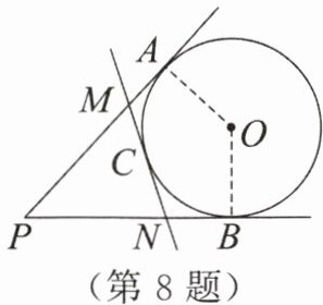 8. 如图,PA,PB分别与⊙O相切于A,B两点,C为⌢AB上一点,过点C作⊙O的切线分别交PA,PB于M,N两点。若△PMN的周长为10,则切线长PA等于______