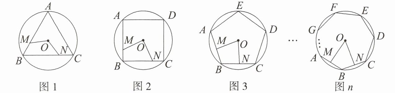 12. 如图,M,N分别是$\odot O$的内接正三角形ABC,正方形ABCD,正五边形ABCDE,……,正n边形ABCDEFG…的边AB,BC上的点,且$BM= CN$,连接OM,ON.