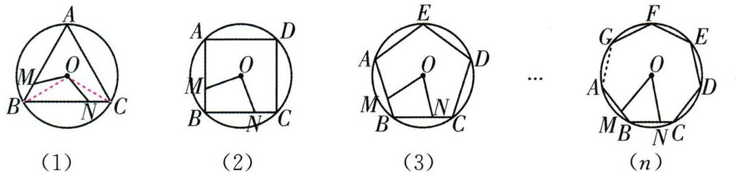 6. 如图(1)(2)(3)…(n),M,N分别是⊙O的内接正三角形ABC,正方形ABCD,正五边形ABCDE,…,正n边形ABCDE…的边AB,BC上的点,且BM= CN,连接OM,ON.