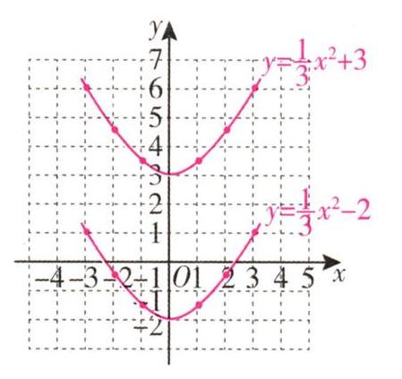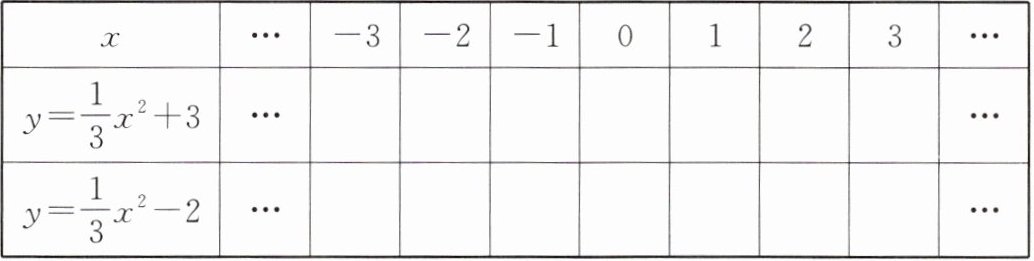 (2)$y=\frac{1}{3}x^{2}+3$:开口向上,对称轴是$y$轴(或直线$x = 0$),顶点坐标$(0,3)$;$y=\frac{1}{3}x^{2}-2$:开口向上,对称轴是$y$轴(或直线$x = 0$),顶点坐标$(0,-2)$。