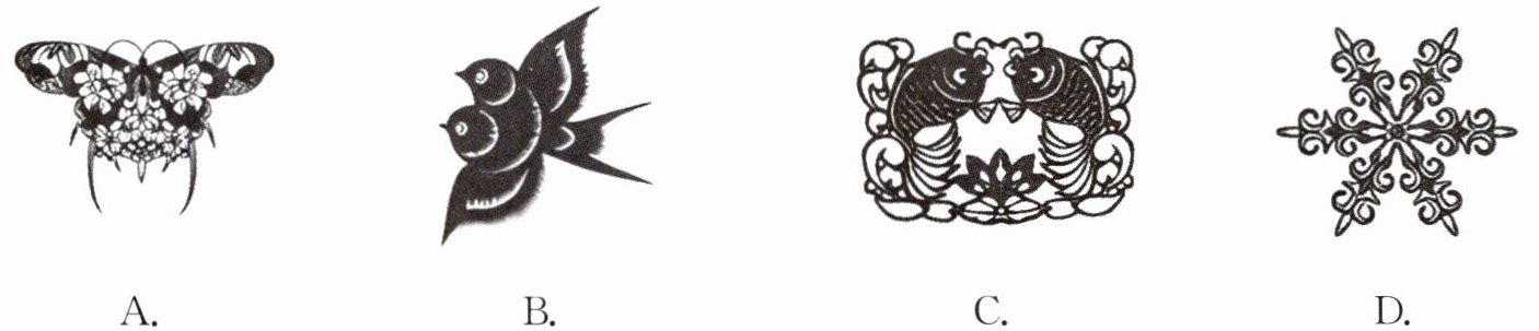 2. 剪纸艺术是最古老的中国民间艺术之一,先后入选中国国家级非物质文化遗产名录和人类非物质文化遗产代表作名录. 以下剪纸中,属于中心对称图形的是( )