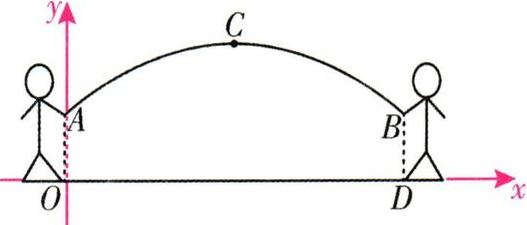 3. [2024闽清期中]如图,同学们在操场上玩跳绳游戏,绳甩到最高处时的形状是抛物线形,摇绳的甲、乙两名同学拿绳的手的间距为6m,到地面的距离AO与BD均为0.9m,绳子甩到最高点C处时,最高点距地面的垂直距离为1.8m.身高为1.4m的小吉站在距点O水平距离为h m处,求他能够正常跳绳(绳子甩到最高时超过他的头顶)时的h的取值范围.