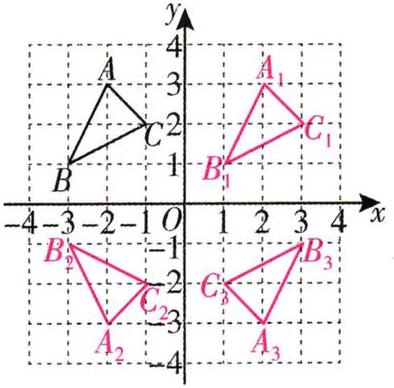 $\triangle A_1B_1C_1$与$\triangle A_3B_3C_3$成轴对称,对称轴是$y$轴;$\triangle A_2B_2C_2$与$\triangle A_3B_3C_3$成中心对称,对称中心的坐标是$(1,0)$。