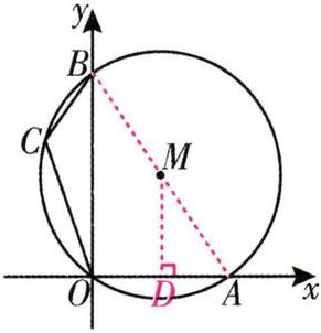 8. 如图,⊙M经过原点O且与两坐标轴分别交于点A和点B,点A的坐标为(4,0),C是⊙M上一点,∠BCO= 120°,求⊙M的半径和圆心M的坐标。