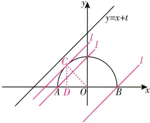 11.如图,半圆的圆心与坐标原点O重合,半圆O的半径为1,直线l的解析式为$ y = x + t $,它与x轴所形成的锐角是$ 45 ^ { \circ } $. 若直线l与半圆只有一个交点,求t的取值范围.