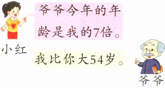 设小红今年x岁,则爷爷今年7x岁。7x−x=54 x=9