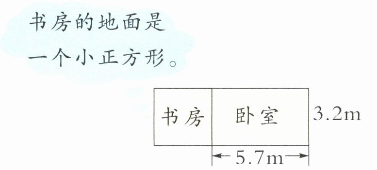 (2)3.2×3.2×50=512(元) 易错警醒书房地面是正方形,书房的边长即为卧室的宽,求卧室的面积比书房大多少,用两者长的差乘宽即可。