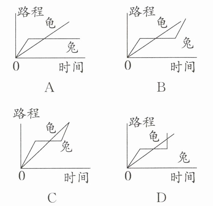 1. 跨学科 龟兔赛跑 “龟兔赛跑”讲述了领先的兔子因为骄傲,睡了一觉。当它醒来时,发现乌龟快到终点了,于是它急忙追赶,但是为时已晚,乌龟还是先到了终点。下面与故事情节相吻合的图是()。