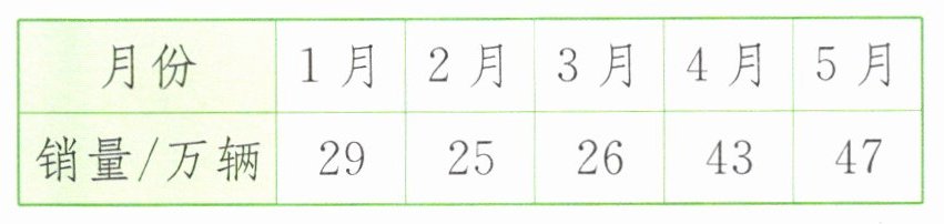 (3)50万辆,理由答案不唯一,合理即可。提示从统计图可知从2月到5月销量呈上升趋势,但除了3月到4月销量大增外,其余都是小幅度变化,所以预测6月份新能源汽车的销量大约能达到50万辆。