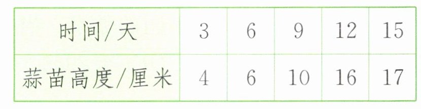 2. 实验班原创 数据意识 蒜苗适宜在温暖、湿润的环境中生长。种植蒜苗需要选择土质疏松、透气性好、排水性好的土壤。下面是明明记录蒜苗15天生长情况的统计表。