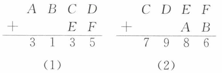 “$E + 3 = 8$”,得出 $E = 5,D = 9$;从竖式(1)的个位“$9 + F = 15$”,得出 $F = 6$,并向十位进1;由竖式(1)的十位“$7 + 5 + 1 = 13$”,并向百位进1,则 $1 + B = 1$,得出 $B = 0$。