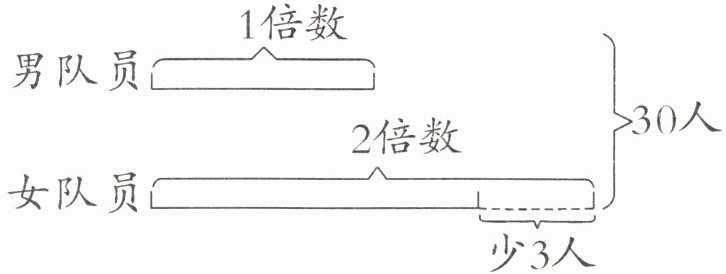 方法二:由题意可知男队员的人数是1倍数,用x人表示,则女队员人数就是$(2x-3)$人,根据男、女队员共有30人,可列出相应方程,进而解决问题。