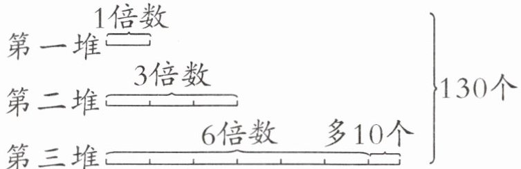 例 三堆苹果共有130个,第二堆的苹果数是第一堆的3倍,第三堆的苹果数比第二堆的2倍多10个。算一算,三堆苹果各有多少个?