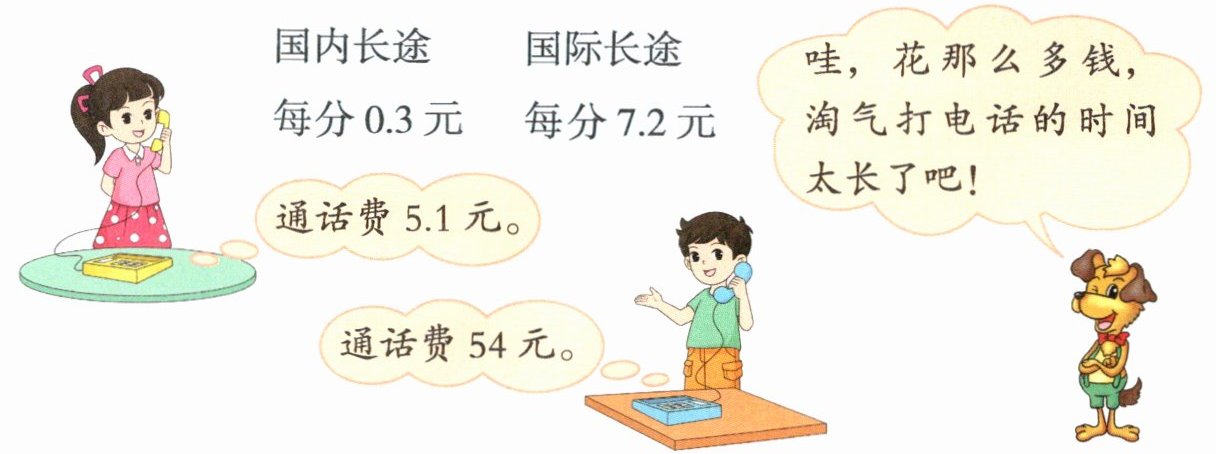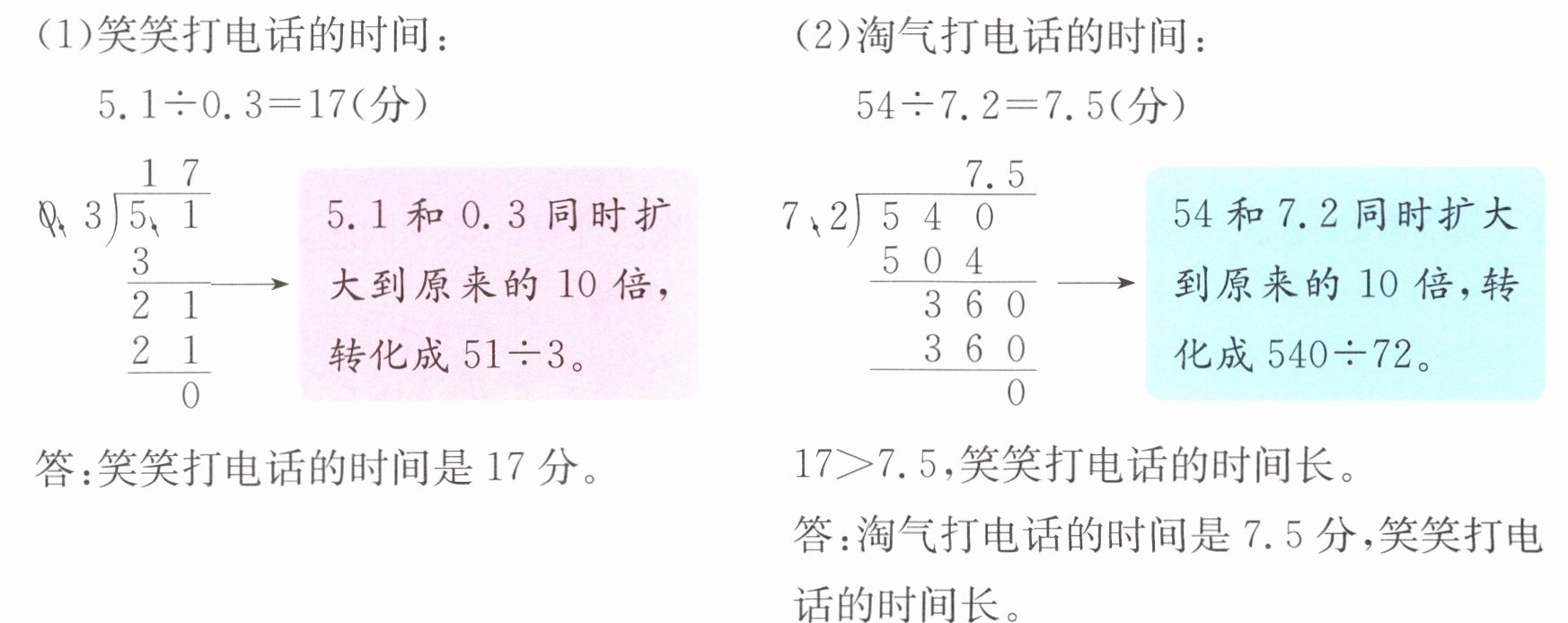 过程探索 要想知道谁打电话的时间长,先分别求出笑笑与淘气打电话的时间,再比较。笑笑打国内长途每分0.3元,用了5.1元,要求笑笑打了几分,就是求5.1里有几个0.3,可以列式为5.1÷0.3;同理,淘气打电话的时间用54÷7.2计算。这两个算式的除数都是(),可以把它们转化成除数是()的除法计算,除数0.3和7.2都是一位小数,把它们扩大到原来的10倍就变成了整数。要使商不变,被除数也应同时扩大到原来的()。这样就把除数是小数的除法转化成了除数是整数的除法。