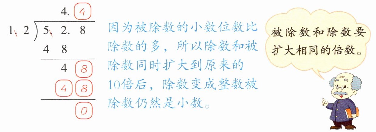 过程探索 求苹果的单价可以用苹果的总价除以苹果的质量,列式为5.28÷1.2。除数是一位小数,可以将被除数和除数同时扩大()倍,再计算。