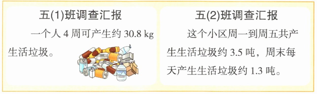 过程探索 (1)有两种方法:方法一:先算4周共有多少天,再算一个人平均每天产生多少千克生活垃圾。方法二:先算一个人每周产生多少千克生活垃圾,再算一个人平均每天产生多少千克生活垃圾。(2)如果要求周末每天比平时多产生多少吨生活垃圾,那么就要先求平时每天产生多少吨垃圾,再与周末每天产生生活垃圾的质量作差。
