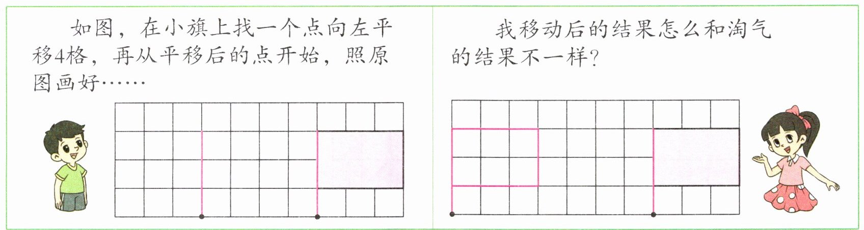 请你画出小旗向左平移4格后得到的图形,并与同伴交流。你能回答笑笑的问题吗?