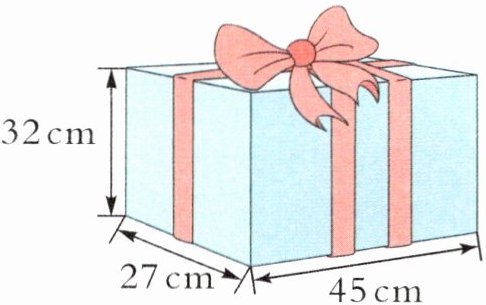 3. 儿童节到了,妈妈给笑笑准备了一个礼物,礼物放在了一个长45cm、宽27cm、高32cm的长方体的盒子里,盒子用丝带捆上(如图),上面用17cm丝带打了一个漂亮的结。妈妈至少用了多少米的丝带?