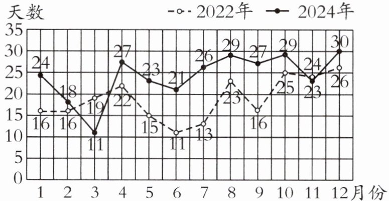 (2)对比这两年相应各月空气质量达到优良的天数,2024年比2022年多的有()个月。