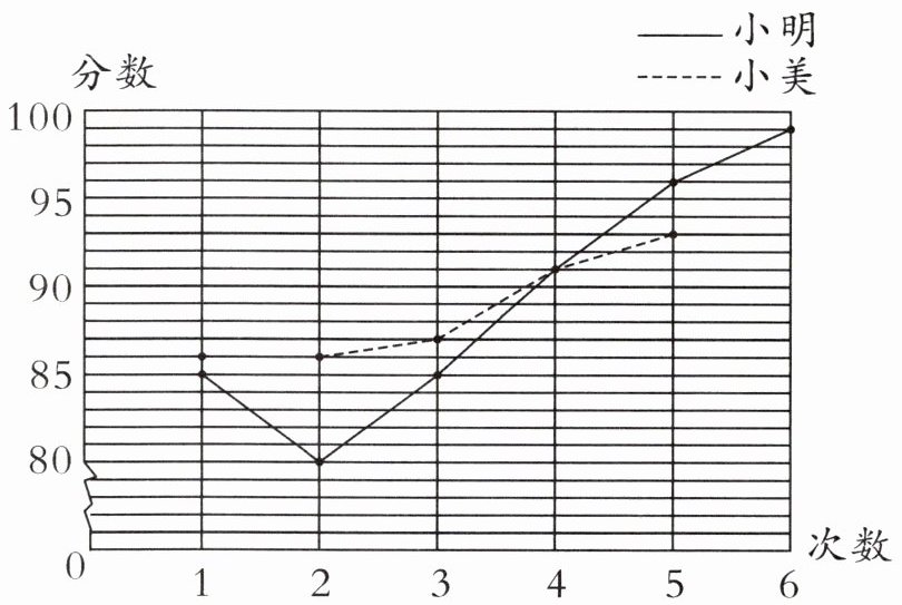 6. 新考法 评价说明 为了传承优秀传统文化,学校将举行“诗词大赛”选拔。下面是小明和小美两人六次初赛成绩统计图。