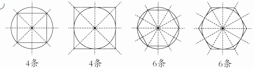 2. 根据圆是轴对称图形,且直径所在的直线是圆的对称轴可知,经过圆心(即中心点)的正多边形的对称轴就是该图形的对称轴。画出并数出各图的对称轴。