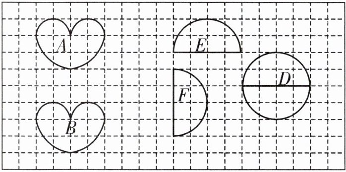 图 A 向下平移 5 格得到图 B。图 E 先向右平移 4 格,再向下平移 2 格;图 F 先绕着圆心顺时针旋转 $ 90^{\circ} $,再向右平移 6 格,最后向上平移 1 格,即可得到图 D。(方法不唯一)