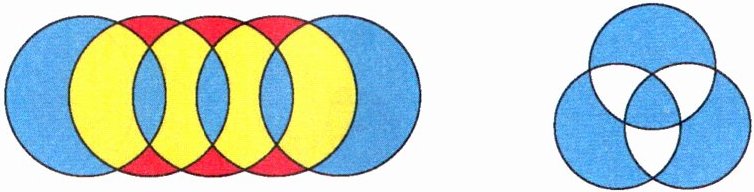 过程探索 观察图形。第1个图形由5个大小相同的圆组成,所有圆心在同一条直线上,间距相等且小于圆的半径。第2个图形由3个大小相同的圆组成,3个圆的圆心正好是等边三角形的3个顶点。
