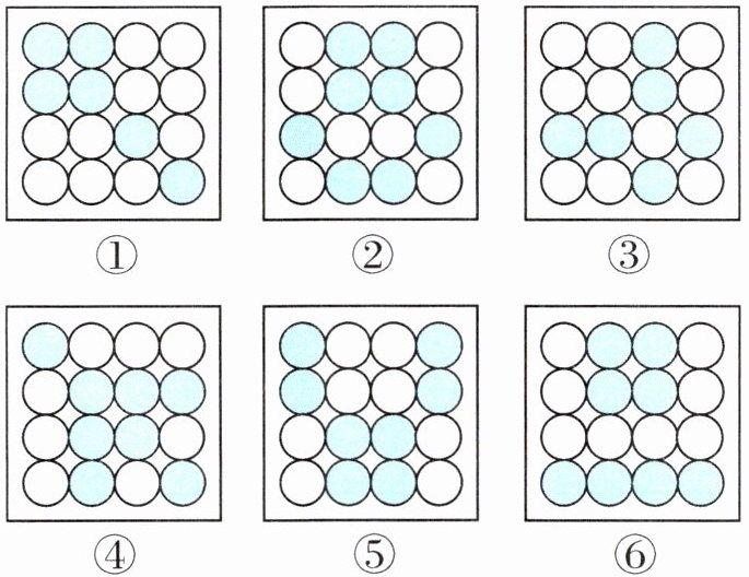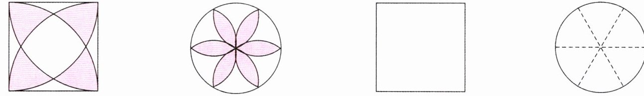 图略 提示第一个图分别以正方形 4 个顶点为圆心,以正方形的边长为半径画 $ \frac{1}{4} $ 圆,并照样子涂色;第 2 个图分别以圆周上 6 个等分点为圆心,以原半径长为半径画 $ \frac{1}{3} $ 圆,并照样子涂色。