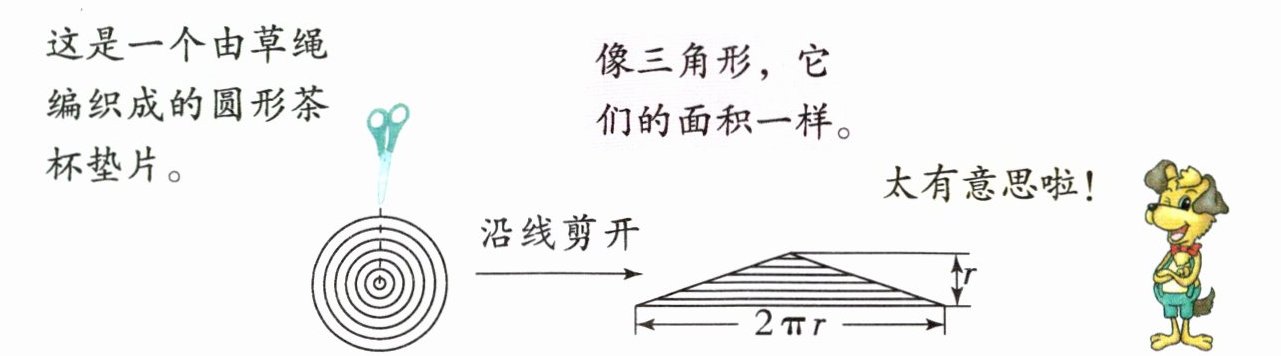 观察图形可知,将圆形剪开拼成类似三角形的形状,此时三角形的底是由圆的周长展开得到的,所以底相当于圆的周长。