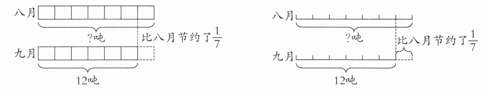过程探索 方法一:用方框图表示。以八月用水量为单位“1”,将八月用水量用7个方框表示,由“九月比八月节约了$\frac {1}{7}$”,可知九月用水量就是用()个方框表示。