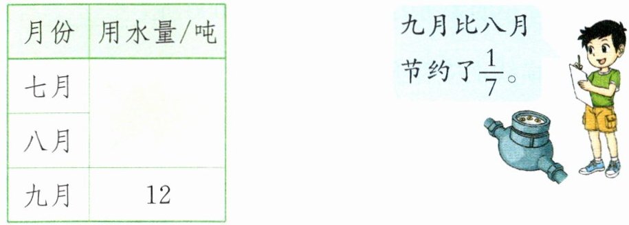 过程探索 已知九月用水量为12吨,且比八月用水量少$\frac {1}{7}$。方法一:用八月用水量减去九月比八月少的用水量,结果就是九月的用水量。方法二:先求出九月份用水量占八月用水量的分率,再用这个分率乘八月用水量,结果就是九月用水量。在列方程解答后别忘记检验。