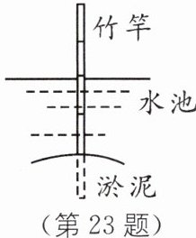 23. 新情境 利用竹竿测水深 一根竹竿插入一水池底部的淤泥中(如图),竹竿的入泥部分占全长的 $ \frac { 1 } { 5 } $. 淤泥以上的入水部分比入泥部分长 $ \frac { 1 } { 2 } $ 米,露出水面部分为 $ \frac { 13 } { 10 } $ 米,竹竿有多长?水有多深?