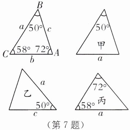 7. 如图,已知$\triangle ABC$的六个元素,则下列甲、乙、丙三个三角形中和$\triangle ABC$全等的是().