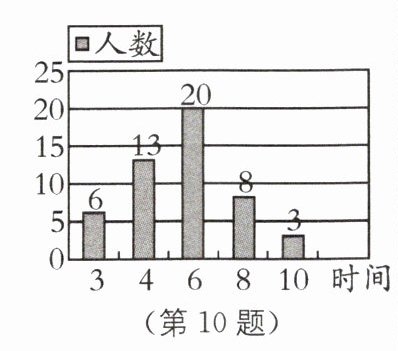 10. 为了解某小区“全民健身”活动的开展情况,某志愿者对居住在该小区的50名成年人一周的体育锻炼时间进行了统计,并绘制成如图所示的条形统计图. 根据图中提供的信息,这50人一周的体育锻炼时间的众数和中位数分别是( ).