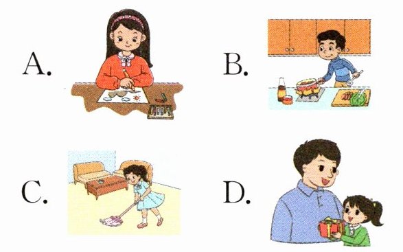三、新情境 孝亲感恩活动分享 三年(1)班开展了“孝亲感恩”的活动,下面是家长们拍摄的照片。读句子,选择与之相符的图片。