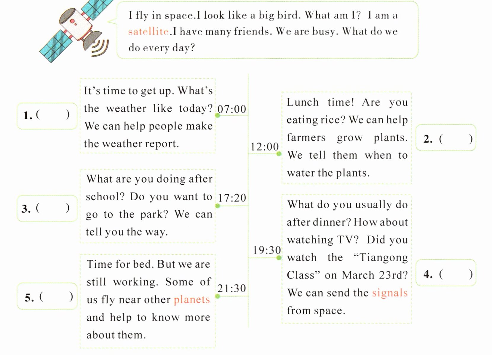 I fly in space. I look like a big bird. What am I? I am a satellite. I have many friends. We are busy. What do we do every day?