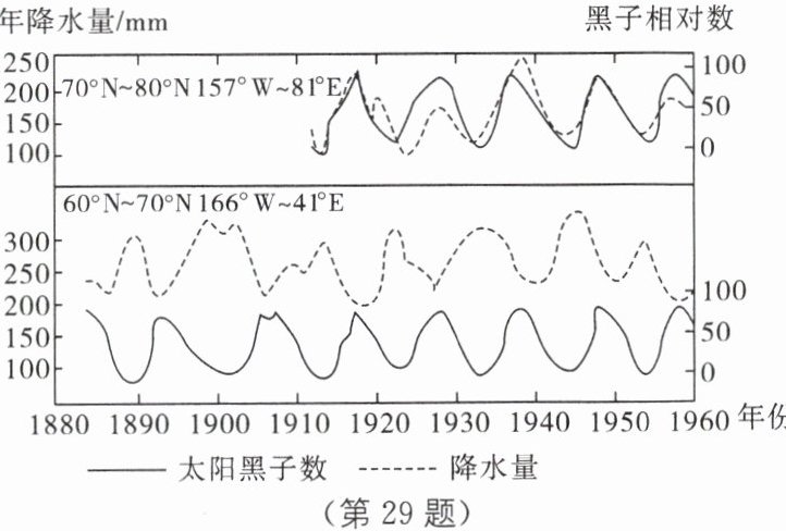 (2)图中各纬度地区降水量年际变化的周期约为____年。这与太阳黑子活动的周期相比,表现出的特点是____。