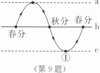 9. 如图所示为太阳直射点移动示意图,其中a、b、c分别表示三条纬线。据图分析可知()。